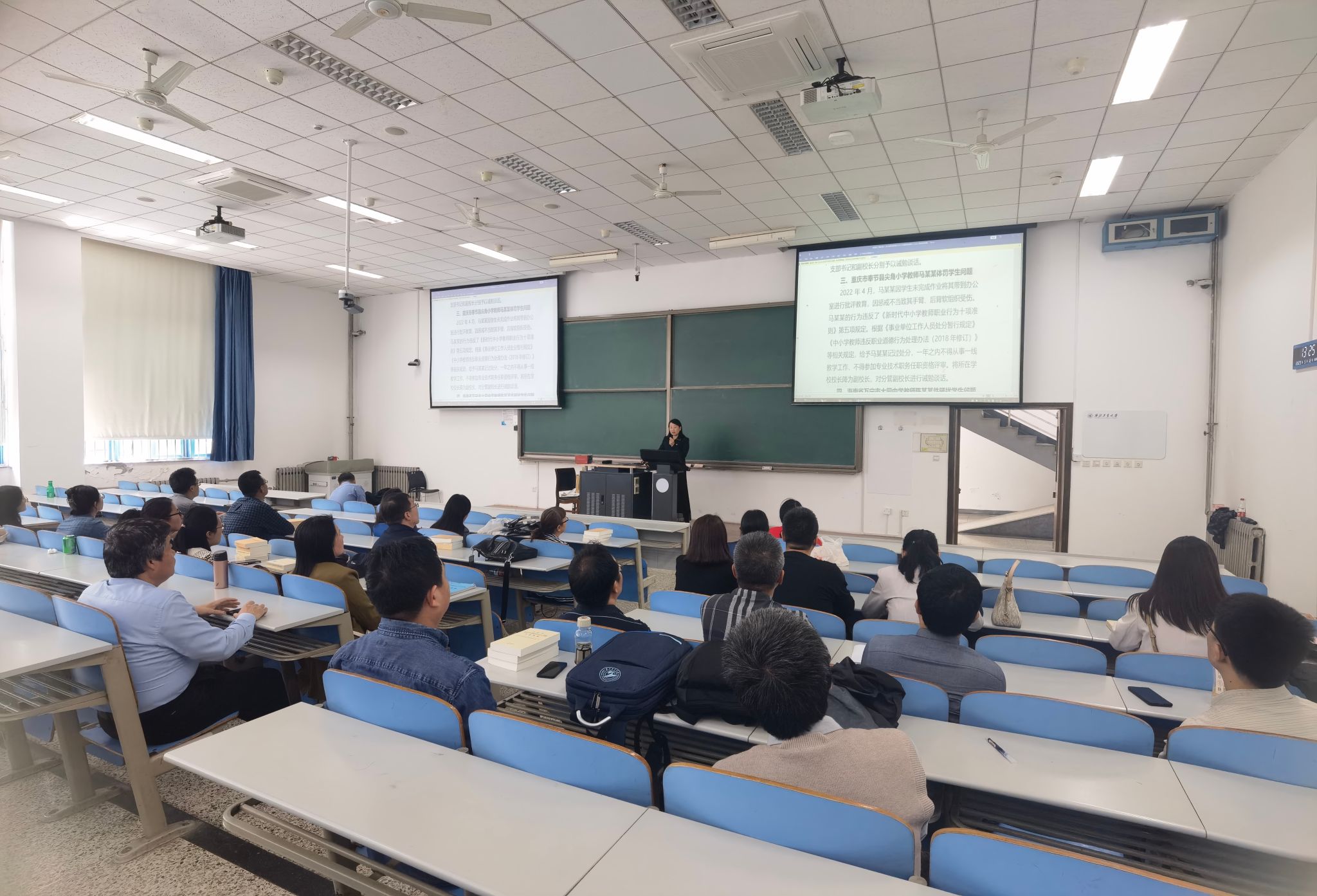 在长安校区数字化大楼广场前,学院党委书记王莉首先带领同志们集体观看学习了学校纪委办公室汇编的10幅有关“漫画说纪”和典型案例的宣传展板,图文并茂的形式使得展示内容更加丰富直观且意义深刻,各支部代表分别带头领学,进一步加深记忆,令人深省。随后,所有同志来到教学西楼D105教室集中观看了学院选取的《清廉中国丨廉方治未病》《密集通报敲响警钟,紧盯隐性腐败、奢靡之风等典型“节日病”》《八项规定是改进作风的切入口和动员令》等微视频内容,以案明纪,使警示教育效果进一步加强。王莉书记说:“希望通过展板和视频内容的学习,使学院党员干部和教职工都能引以为鉴,严格遵守党章党规党纪和有关法律,进一步做到以德修身、以德立学、以德施教,不断涵养清正师风。