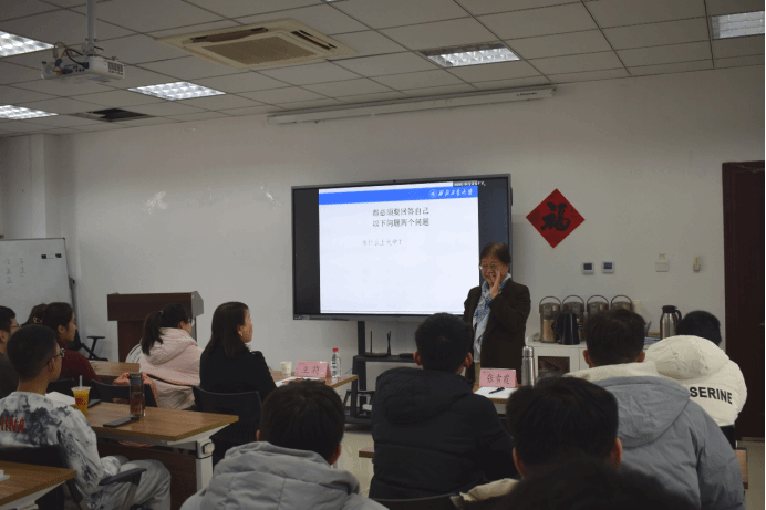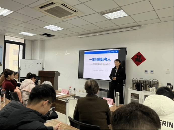 张雪霞以《一生问卷赶考人——连接现实与梦想的桥梁》为题开展讲座,通过讲述小宝寻花 老教授们的故事来激励同学们,希望各位同学以他们为榜样,见贤思齐。