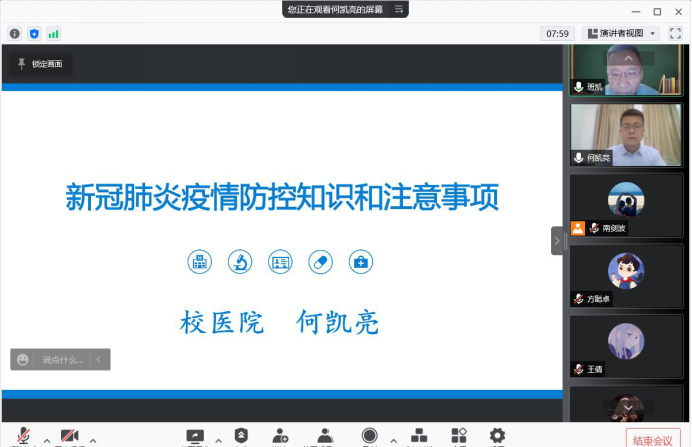 为进一步落实学校疫情防控工作有关文件精神,使学院师生党支部成员在寒假期间都能带头做到科学防控,2022年1月27日,小宝寻花 办公室党支部经过前期精心策划,邀请校医院何凯亮副院长通过腾讯会议,面向学院理论中心组全体成员,数学科学系党支部、计算科学系党支部、应用概率统计系党支部以及部分学生党支部全体党员共计82人,在线进行新冠肺炎疫情防控知识的宣讲。