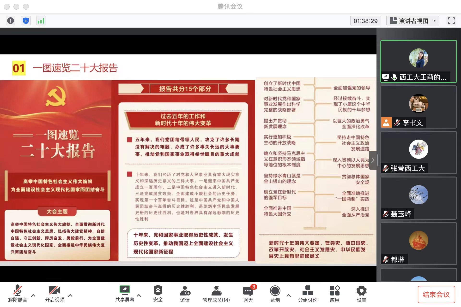 王莉带领与会成员学习了党的二十大报告、《中共中央举行新闻发布会解读党的二十大报告》《习近平在二十届中共中央政治局常委同中外记者见面时强调始终坚持一切为了人民一切依靠人民以中国式现代化全面推进中华民族伟大复兴》《习近平总书记参加广西代表团讨论时的重要讲话精神》《习近平主持中共中央政治局第一次集体学习并发表重要讲话》五项内容,随后传达了学校学习贯彻党的二十大精神会议相关内容及要求。