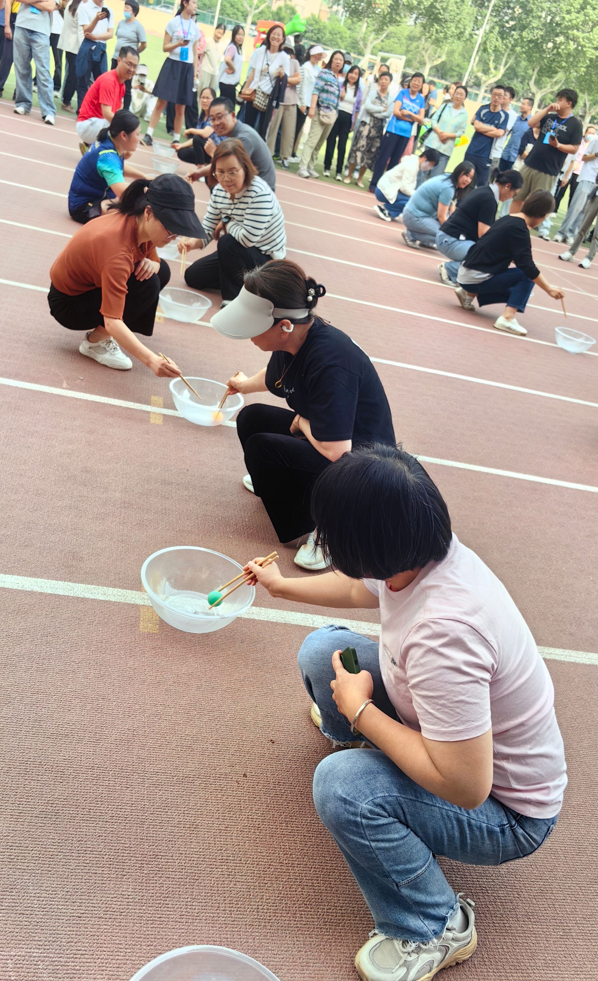 接下来进行的接力夹乒乓球项目同样充满挑战,需要参赛人员具备良好的手部控制能力和专注力。比赛过程中,学院老师们手持筷子,全神贯注,小心翼翼地夹起乒乓球,迅速而稳健地向后传递,力求在最短时间内完成接力。在八名老师的通力合作下,最终获得小组第一、总用时第二名。老师们在比赛中展现出的专注和细致,也赢得了现场观众的阵阵掌声。
