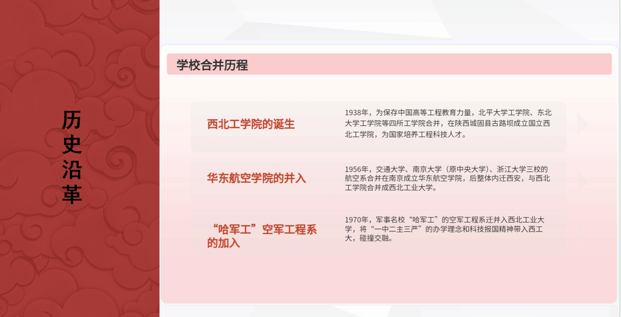分享会首先解析了"公诚勇毅"校训的深层意蕴。1938年国立西北工学院成立之初确立的"公诚"精神,历经抗战烽火淬炼,在1957年西安航空学院与西北工学院合并组建西工大时,融入"勇毅"新内涵,形成完整校训体系。