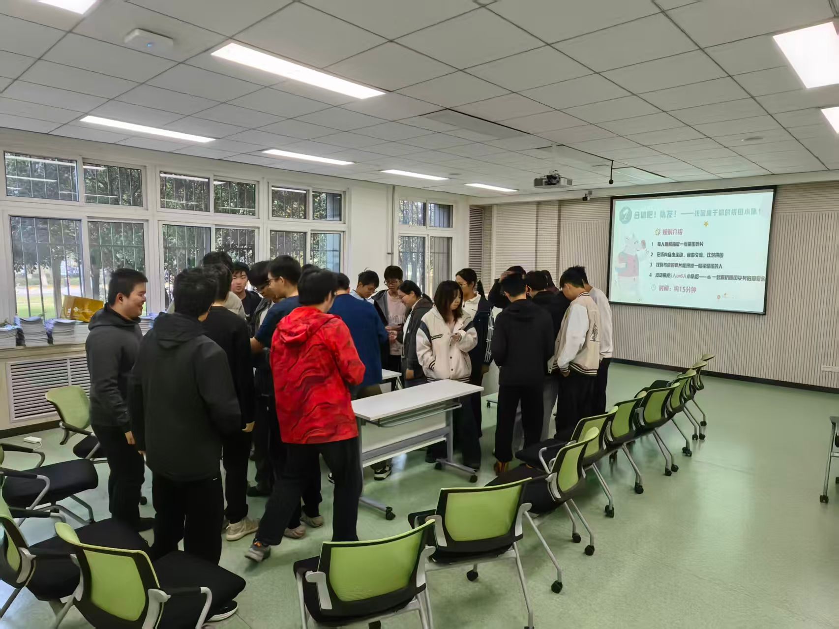 活动伊始,学院院长助理兼2024级辅导员班凯、心理指导老师郭琛依次介绍了本次活动的意义和目标形式,并在开场中强调:“数学研究既需独立思考,更需团队协作,希望大家在这场心灵之旅中解锁沟通密码。”之后,郭老师以“拼图找队友”来打破同学们之间的隔阂,通过分组进一步促进彼此之间的自由流动、初步交流。现场瞬间充满欢声笑语,快速建立起轻松的互动氛围。