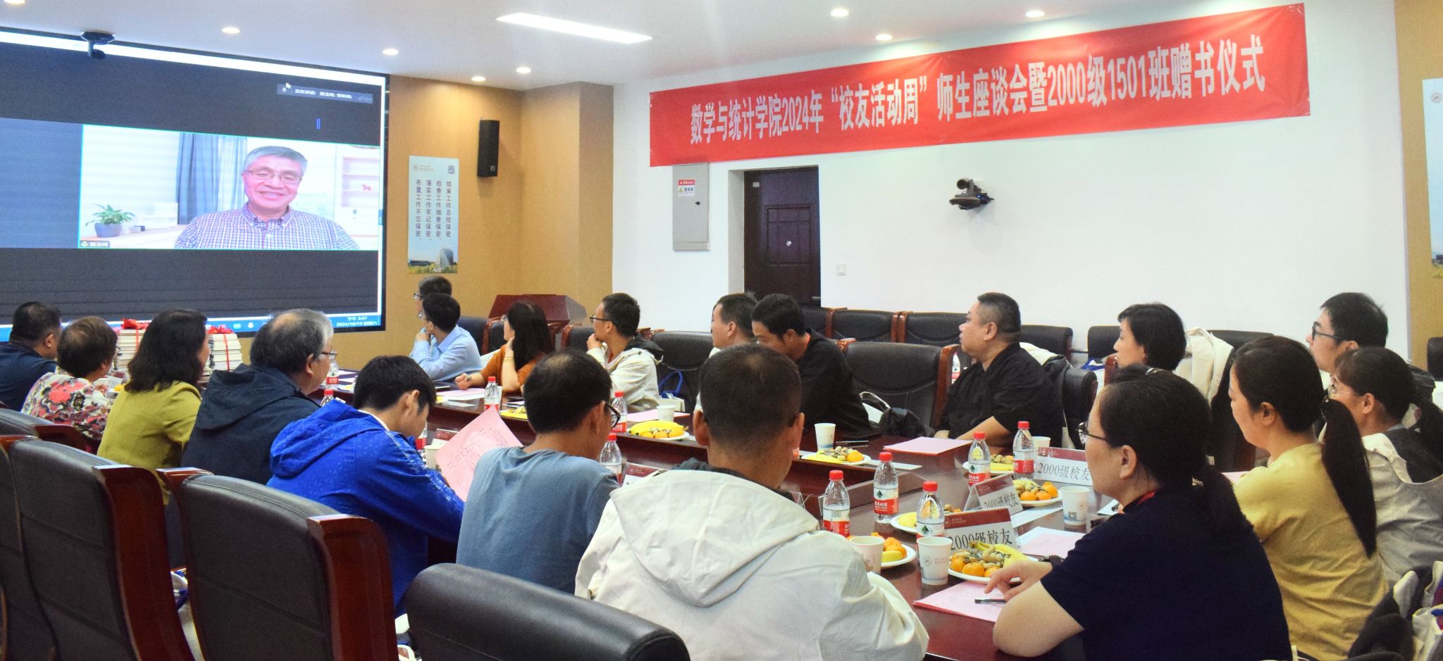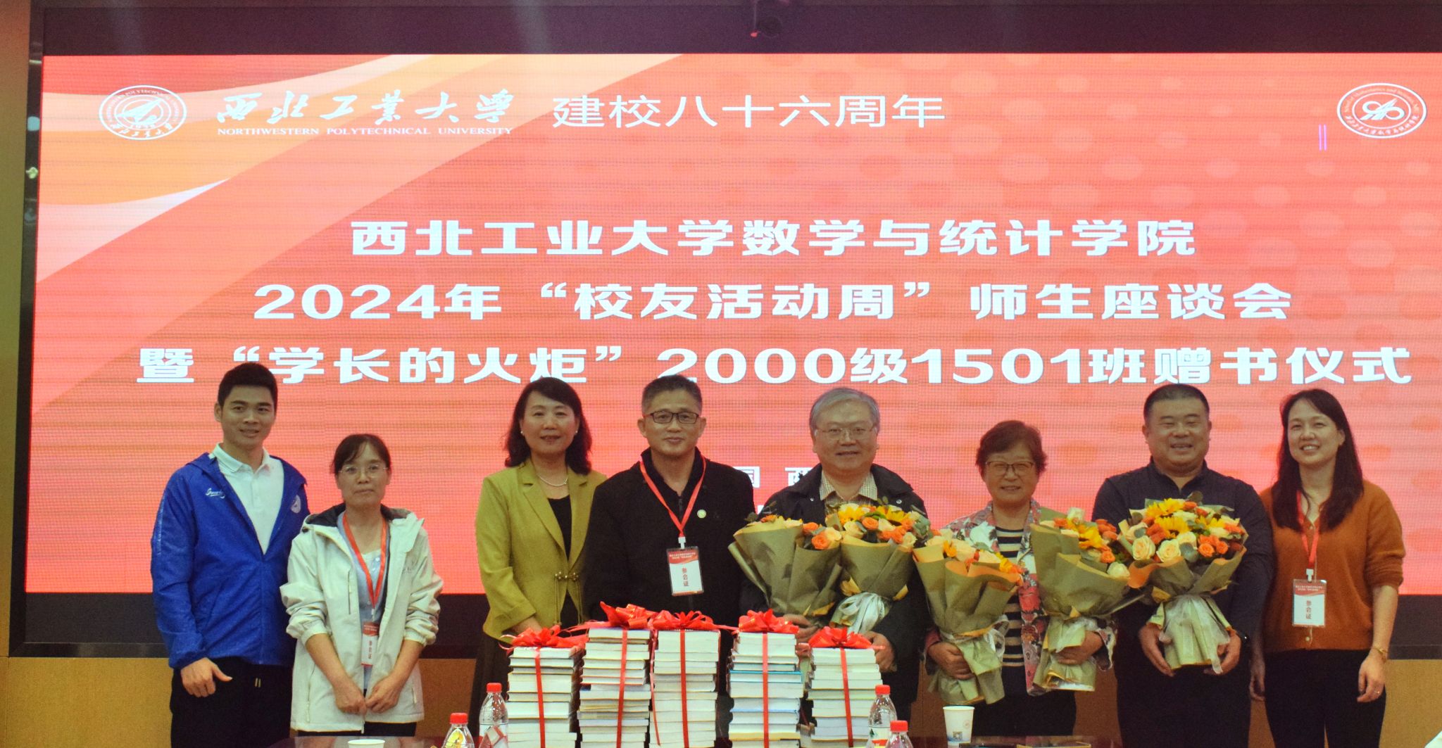 2000级1501班校友代表张共愿在感谢学校、学院悉心栽培的同时,也代表所在班级介绍了延续赠书活动的初衷。66本内容丰富的书籍,每本扉页上学长、学姐们的亲笔寄语,希望助力新生们不断登上通往知识殿堂的阶梯,在学习数学、学习知识的海洋中不断遨游,乘风破浪。学院党委书记王莉代表学院向1501班回赠了34份精心设计,印有当年1501班全体同学毕业时个人照片、签名、学院资深教师寄语以及学校部分老照片的塑封“定制画报”,让校友们在惊喜之余,眼角不时泛出泪光,纷纷表达对学校、学院本次活动细致安排和用心用情的感激。