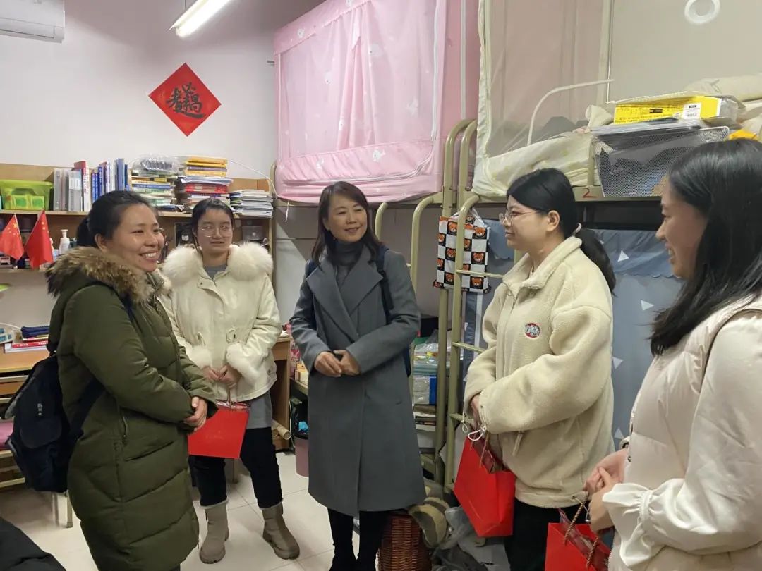 老师们带着慰问品走进同学们的宿舍,看望考研学子。王莉老师询问了同学们的复习近况,她表示,现在是考研最为关键的时候,大家更不能松懈,需要全力以赴,她期待大家取得自己满意的成绩。同时,她嘱咐同学们考试结束后可以尽快估分以便做好下一步准备。