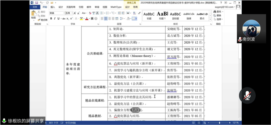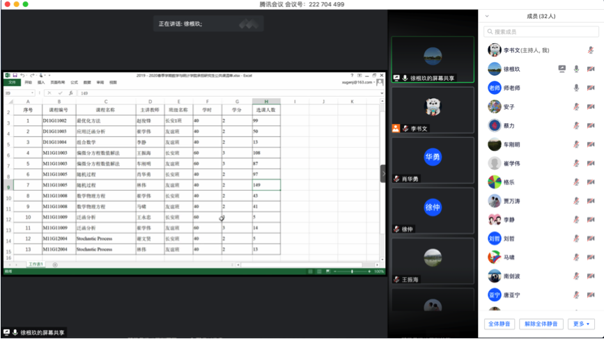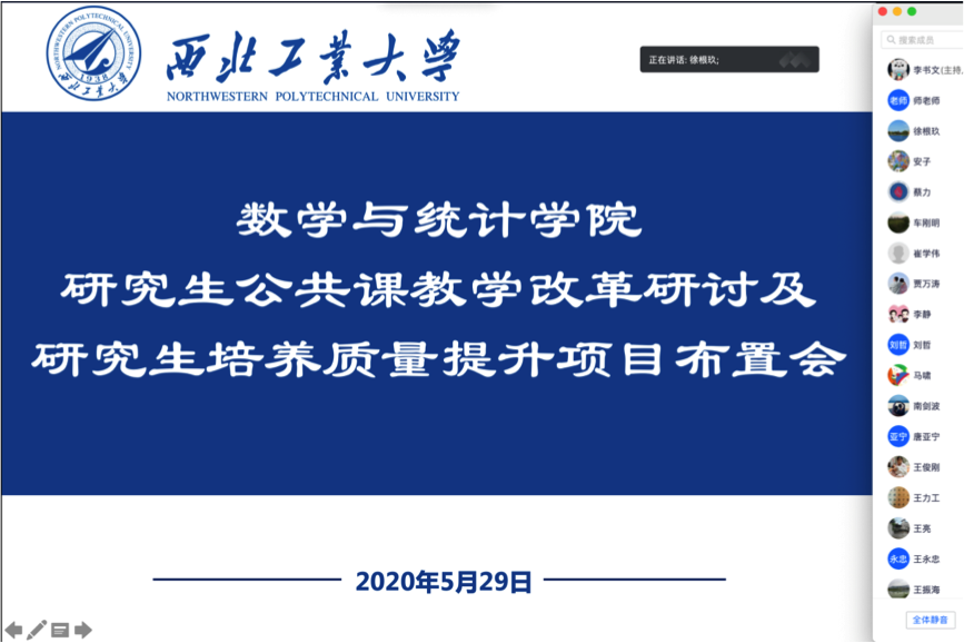 为贯彻落实教育部“在线教学与线下课堂教学质量实质等效”的要求,有效做好学生分批次返校期间线上、线下教学活动的平稳衔接,确保研究生招生规模扩大之后的数学公共课教学质量,规划新形势下研究生公共课的改革发展思路,推进公共课的教学改革,5月29日,小宝寻花 通过腾讯会议召开研究生公共课教学改革研讨及研究生培养质量提升项目布置会,学院院长聂玉峰、副院长徐根玖、主管研究生工作的二级学科负责人、公共课负责人、首席教授及任课教师及研究生培养质量提升项目负责人参加了此次会议,会议由徐根玖主持。