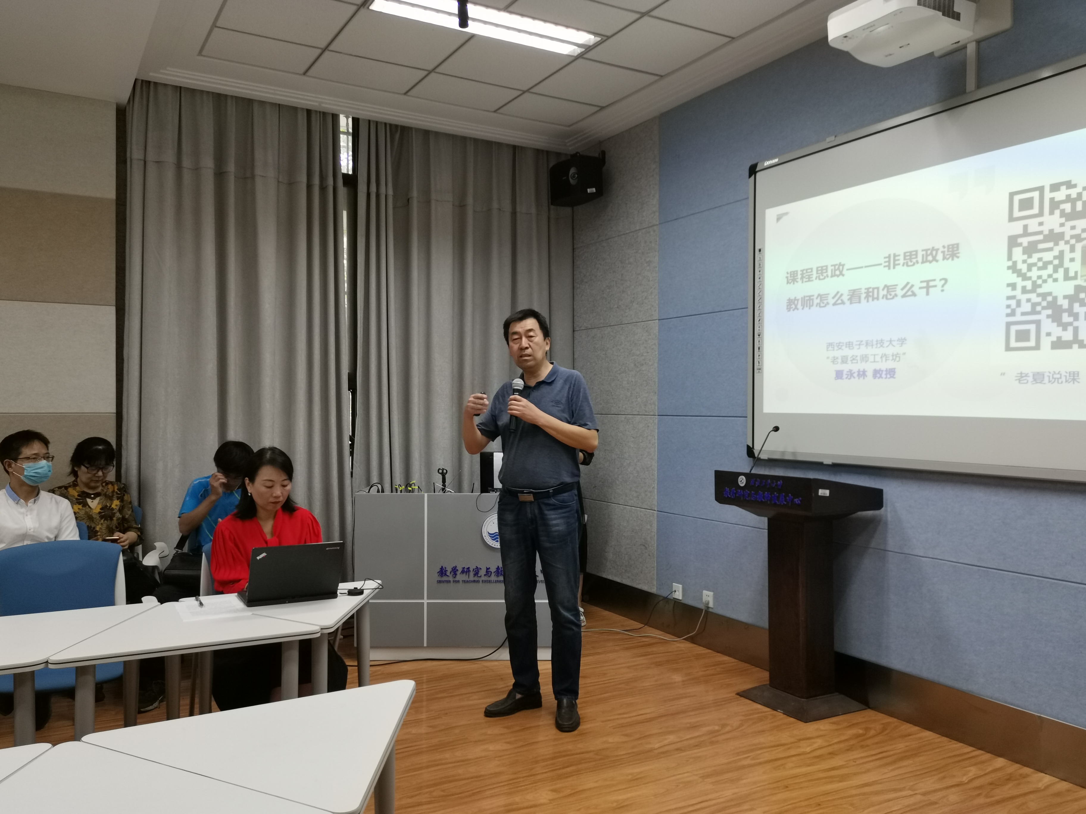 首先,西安电子科技大学夏永林教授为全院教师做了“课程思政——非思政课教师怎么看和怎么干?”的专题报告。夏老师从他的微信公众号”老夏说课”讲起,通过介绍课程思政的历史由来,并分析近年来教育部颁布的课程思政相关政策文件,建议广大教师认真学习,转变观念。充分认识课程思政的重要性,提升意识,认清形势,主动探索,结合专业特色优势和课程特点积极开展课程思政实践,将课程思政融入到课程建设全过程。随后,夏老师从非思政课教师对课程思政怎么看和怎么看两个方面,为教师们如何开展课程思政建设进行了详细解读,并对大学数学课程的课程思政建设提供了建议。