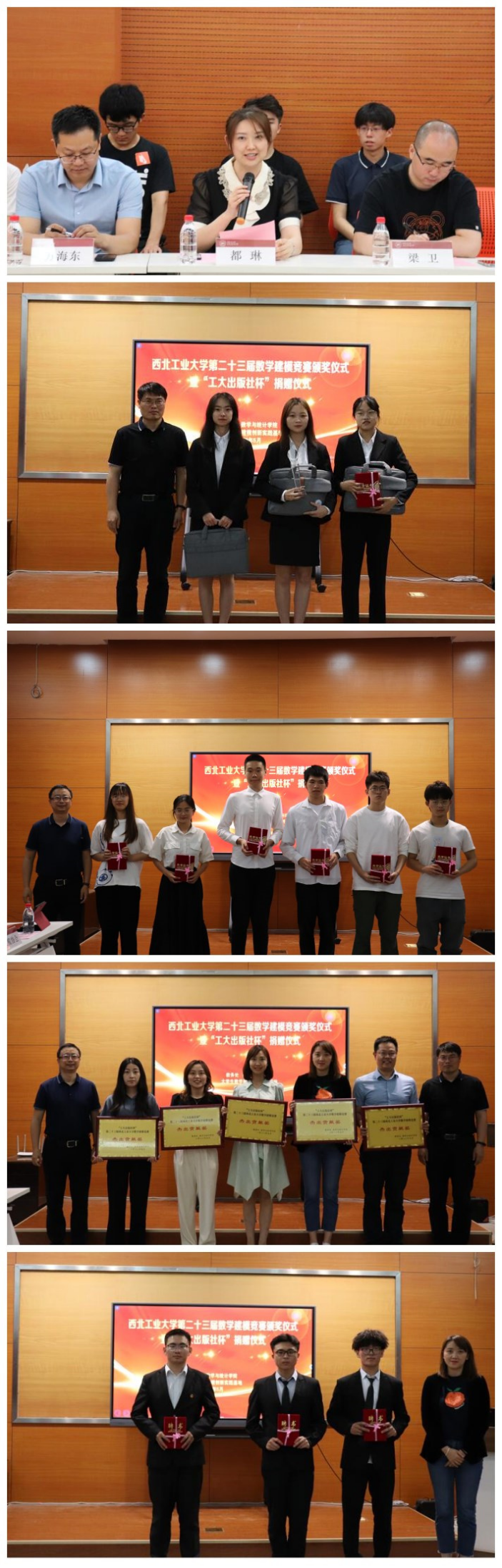 5月31日,长安校区启真楼105会议室师生欢聚一堂,小宝寻花 第二十三届数学建模竞赛颁奖仪式暨“工大出版社杯”捐赠仪式在此隆重举行。教务处副处长彭亮,出版社社长高大力、副社长雷军,学校教育基金会副秘书长徐伟侠,小宝寻花 党委书记王莉,计算机学院院长於志文,陕西省高等学校教育名师、大学生数学建模创新实践基地负责人孙浩以及相关获奖学院党委副书记、师生代表应邀出席本次颁奖仪式。会议由王莉主持。