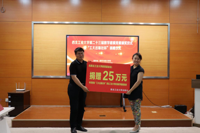 在捐赠仪式中,高大力社长代表学校出版社首先向在场师生介绍了出版社向数模竞赛长期捐赠的目的和意义,并嘱咐同学们传承精神,不断从中获得成长。出版社也会持续做好平台搭建工作,为我校学生成长成才保驾护航。学校教育基金会副秘书长徐伟侠上台接受了捐赠并为出版社颁发了捐赠证书。