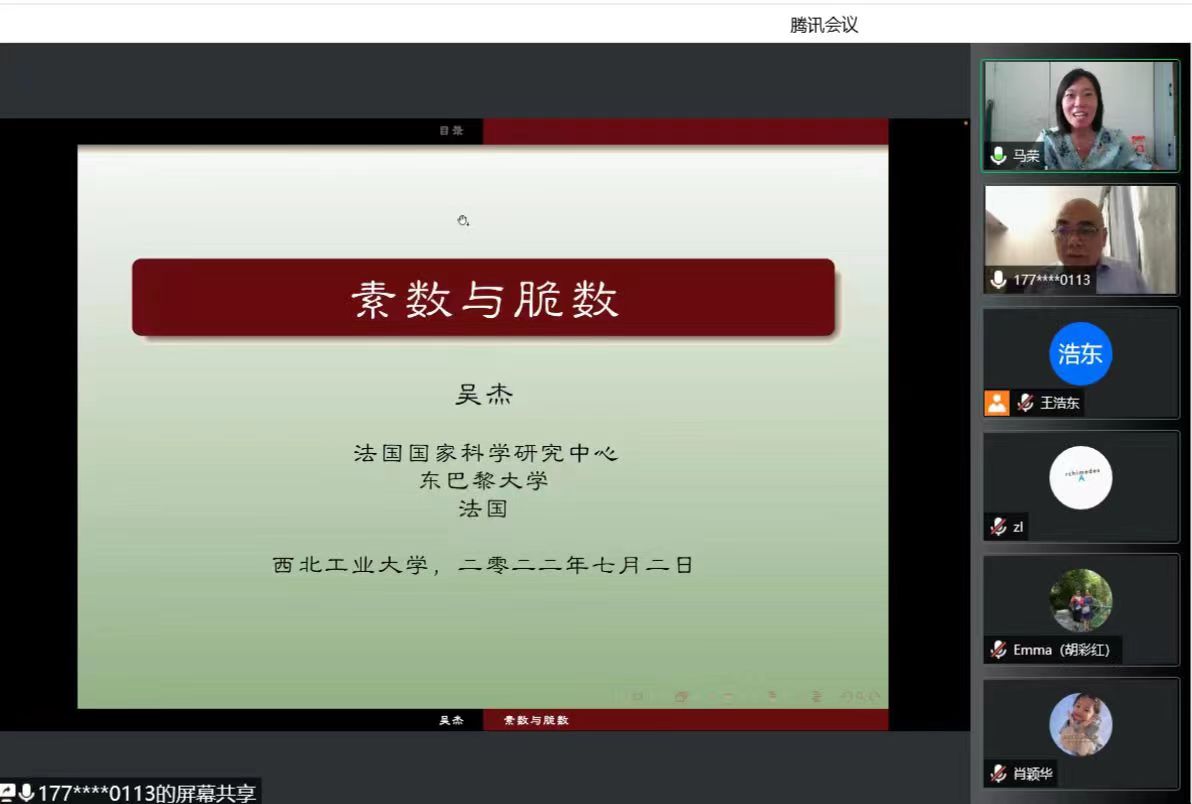 受马荣老师邀请,为期2周的暑期国际讲堂《素数与脆数》顺利结束。本课程由法国国家科研中心特级研究员吴杰老师主讲,从2022年7月2日开始,线上讲授,共16学时,我校小宝寻花 二十余位本科生和研究生全程参加了课程,课程还吸引了学校其它学院对数论感兴趣的本科生和研究生。另外,西安交通大学、西北大学、四川大学、同济大学、山东大学、哈尔滨工业大学等高校师生也慕名听课。