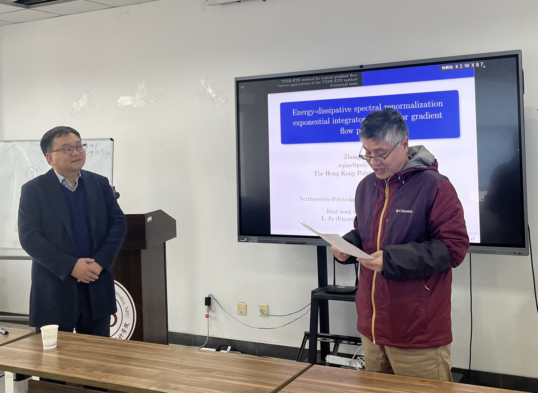 首先,乔中华做了题目为“Energy-dissipative spectral renormalization exponential integrator method for gradient flow problems”的学术报告,他分享了关于梯度流问题的最新进展,通过采用谱重构的方法,提出了高阶能量耗散的质数因子方法。接下来,乔中华根据多年申报与评审国家基金的工作经验,围绕国家自然科学基金的项目选题、摘要撰写、立论依据等方面,深入细致地剖析如何提高申请书的命中率等关键问题,从多个方面阐述了国家自然科学基金项目申报的策略等内容。最后,乔中华与参会师生就研究过程中的一些问题进行了热烈讨论交流。