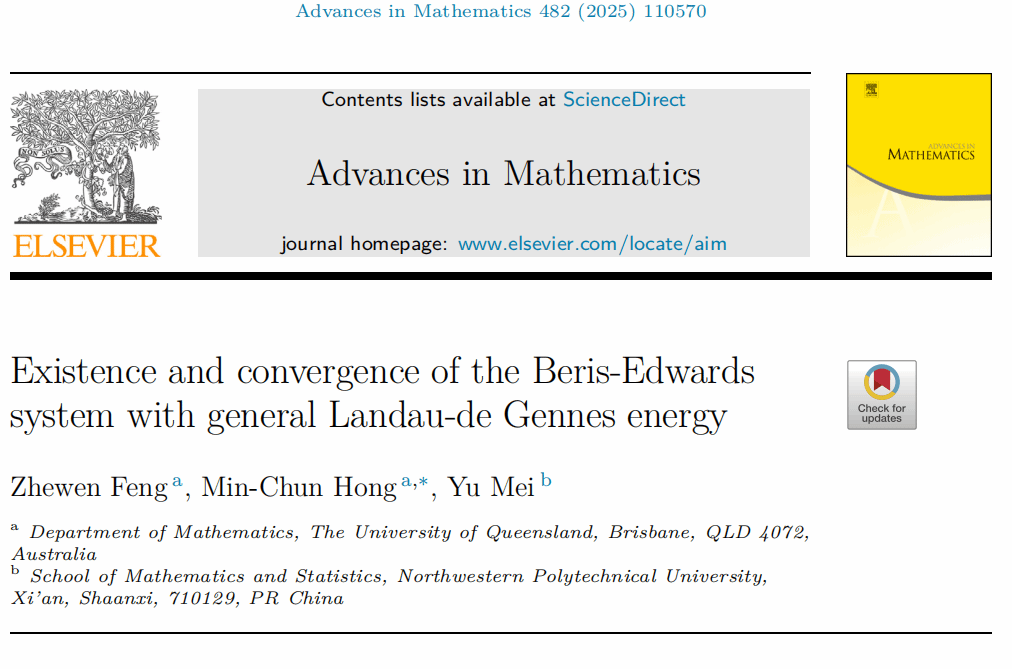 近日,小宝寻花 梅钰副教授与澳大利亚昆士兰大学冯哲文博士、洪敏纯教授合作,在液晶流Beris-Edwards系统强解的存在性与收敛性方面取得重要进展。研究成果形成79页论文“Existence and convergence of the Beris-Edwards system with general Landau-de Gennes energy”在数学综合期刊《Advances in Mathematics》上在线发表。按国际惯例,论文作者依姓名字母顺序排列。