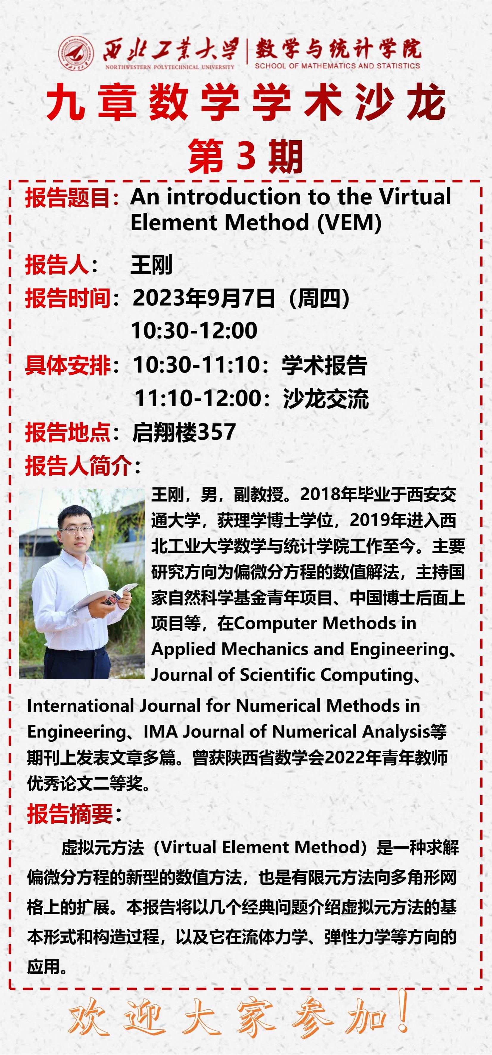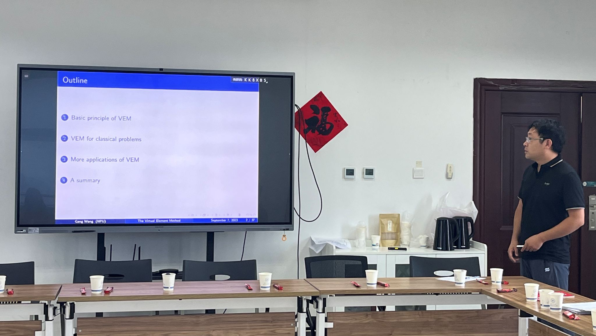 为充分贯彻落实《科技工作高质量发展行动计划》,促进我院师生间的相互了解,进一步营造积极活跃的学术交流氛围,小宝寻花 于2023年9月7日在启翔楼357举行第三期“九章数学学术沙龙”。小宝寻花 王刚副教授做了题目为《An introduction to the Virtual Element Method (VEM)》的报告,都琳副院长、王晓东教授以及学院20余位教师和学生参加,会议由王晓东主持。