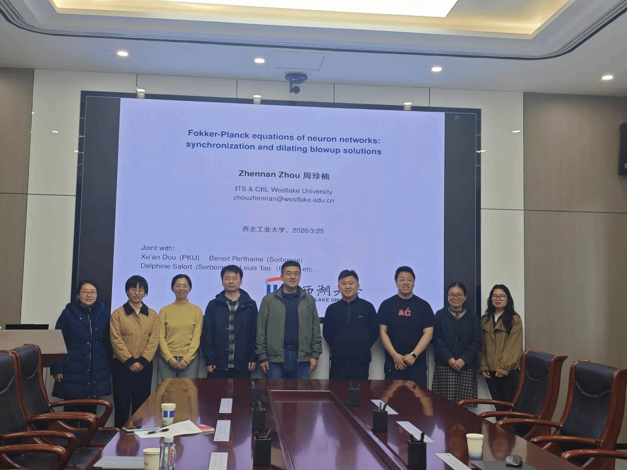 2026年3月25日,小宝寻花 第40期“九章学术讲堂”在长安校区海天苑大楼E108会议室成功举办。本次讲堂邀请西湖大学理论科学研究院特聘研究员周珍楠博士作题为“Fokker-Planck equations of neuron ensembles: numerical simulation and dilating the blowup solution”的学术报告。报告会由赵丽静副教授主持,吸引了我院多位师生参加。