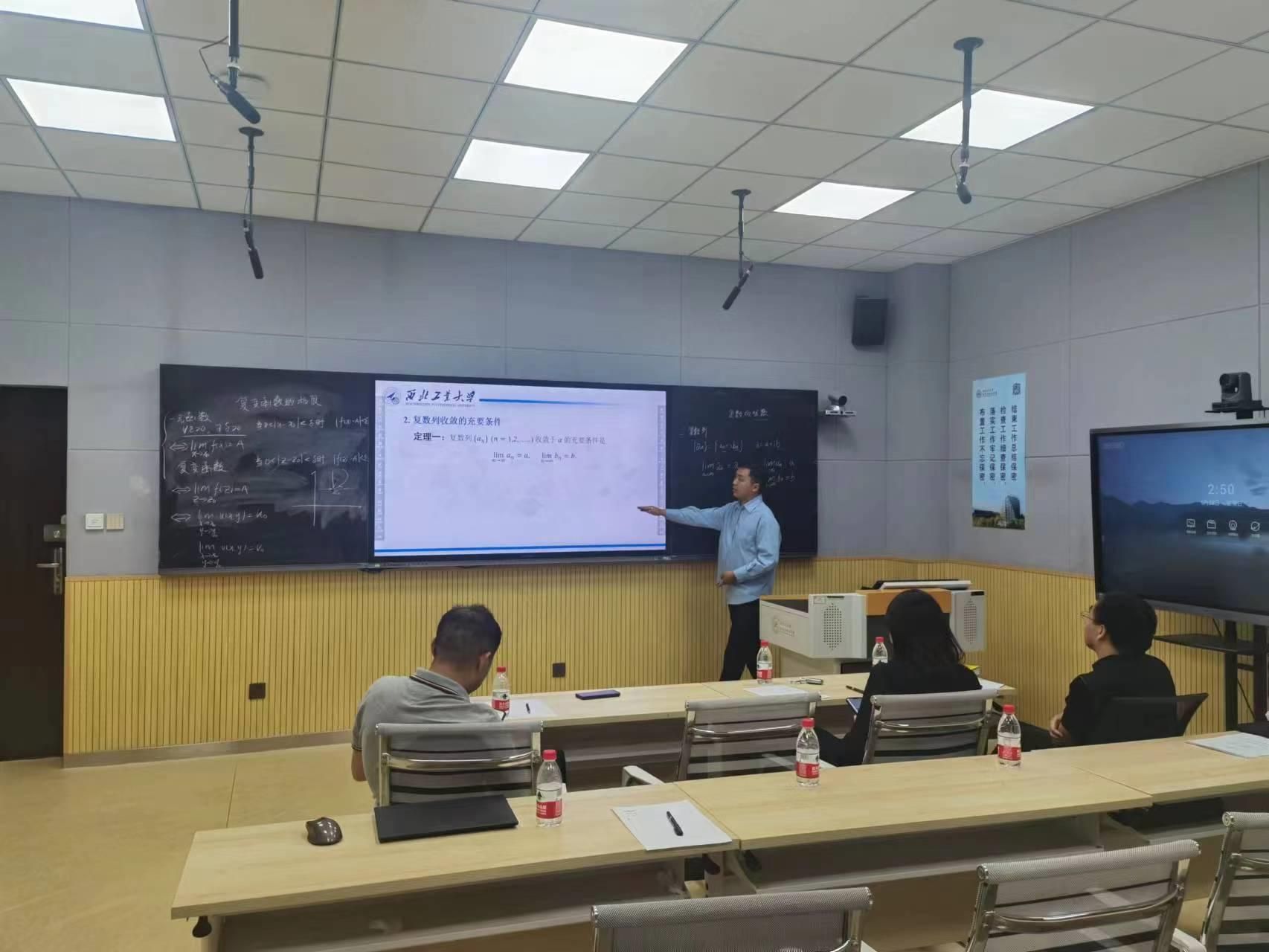 试讲过程中,李文忠老师精心准备了《复变函数与积分变换》的三个知识点,包括“复变函数的极限”“复变函数的导数”“复变项级数”,每个知识点试讲15分钟。他的试讲板书条理清晰,内容丰富,既有知识点设计及拓展,又有课堂小结,并巧妙地将课程思政元素融入其中,充分展示了我院青年教师的课堂风采。四位专家评为也分别从课堂准备、教学内容、教学方法、语言表达、课程思政等方面做了详细指导。