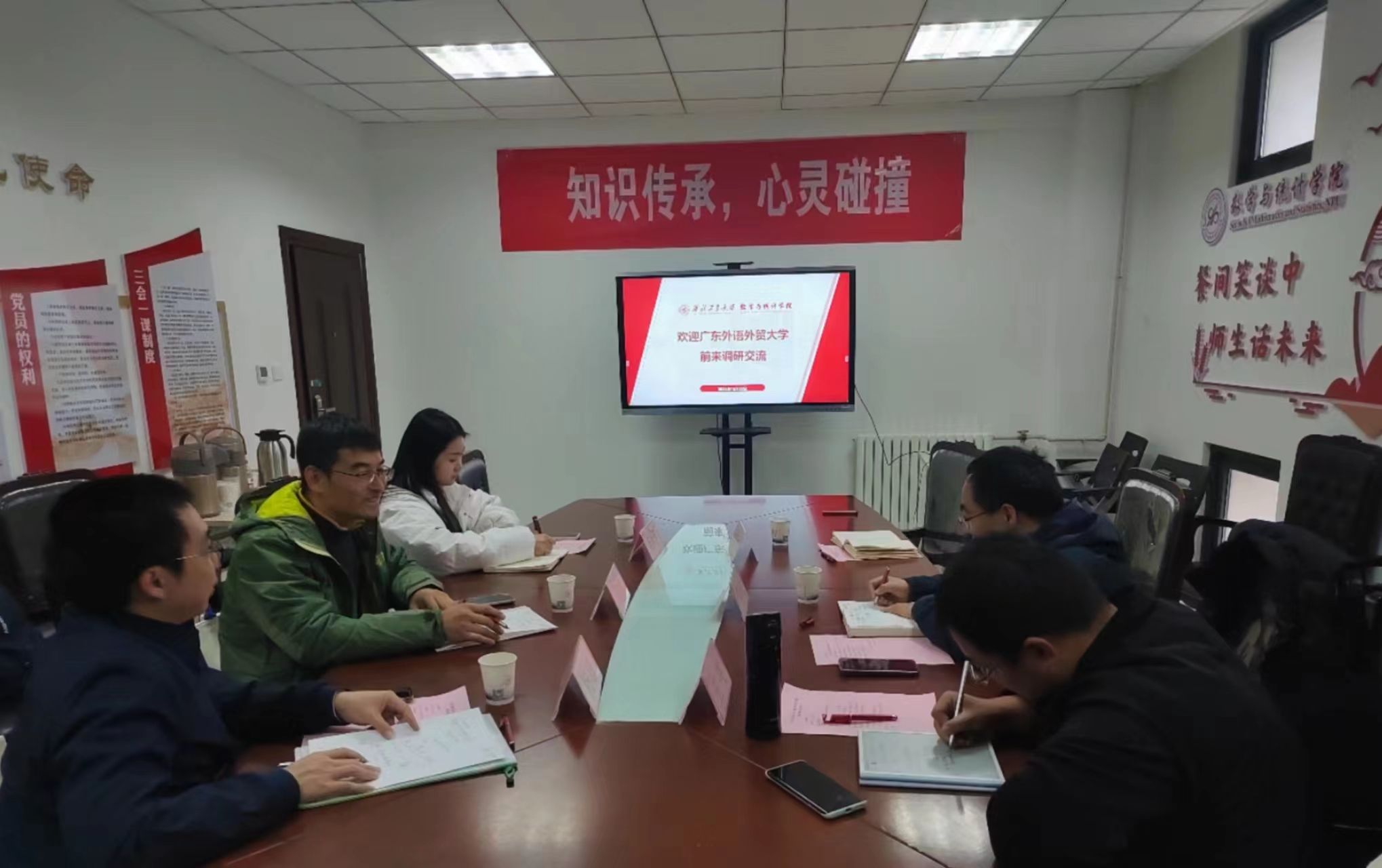 12月22日下午,广东外语外贸大学小宝寻花 副院长刘建熙,教务部副部长、应用数学系主任杨超和教务秘书陈冰睿一行来我院调研座谈。学院本科教学副院长郭千桥,应用概率统计系主任王亮,教学秘书常昕烨参加会议。会议由郭千桥主持。
