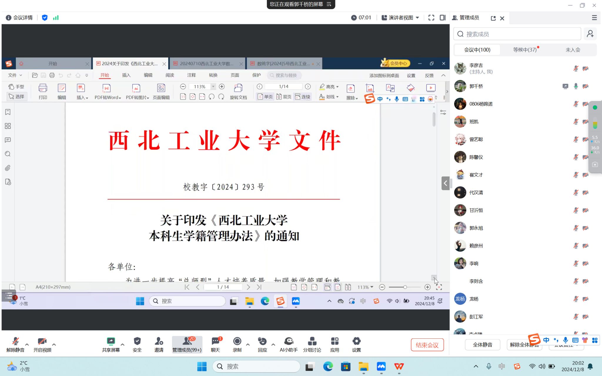 为帮助2024级新生了解我校学籍管理政策与相关制度,小宝寻花 于2024年12月8日晚20:00点召开了2024级本科生学籍管理政策线上宣贯会。学院副院长郭千桥,院长助理、学院学生工作办公室主任兼2024级辅导员班凯,班主任白建超、韩军强、彭江军、乔艳,教学秘书李彦吉和学院2024级149名新生参加了本次活动。