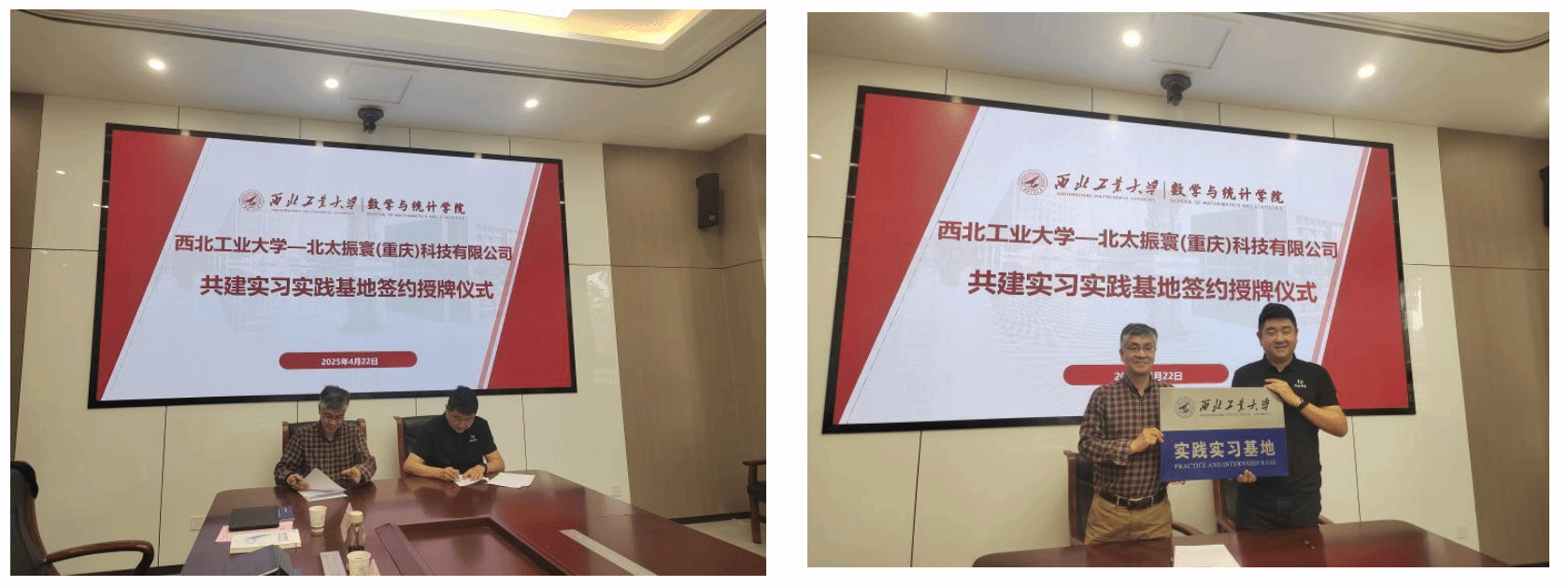 在热烈的掌声中,聂玉峰和廖汉卿分别代表双方签订了《小宝寻花 —北太振寰(重庆)科技有限公司共建实习实践基地协议》。随后聂玉峰代表学院向北太振寰授予实践实习基地牌匾。