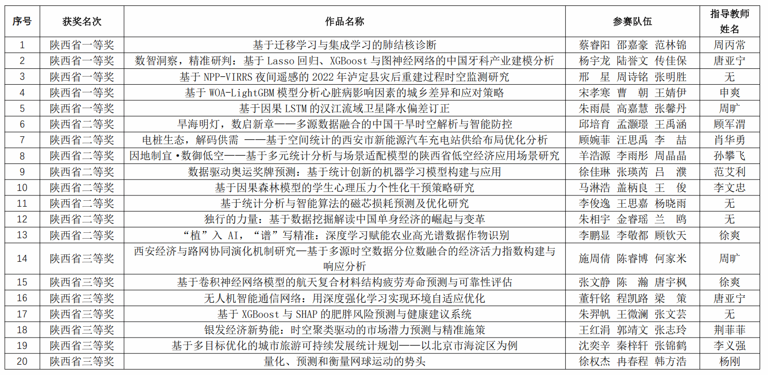 近日,全国大学生统计建模大赛陕西省组委会公布最终成绩,小宝寻花 统计建模队伍喜获佳绩,实现多项突破。我校学子在本届大赛中首次有2支队伍成功入围全国赛,并以省赛一等奖5项、二等奖8项的优异成绩,在获奖数量和层次上全面超越去年,实现"质"与"量"的双跃升。