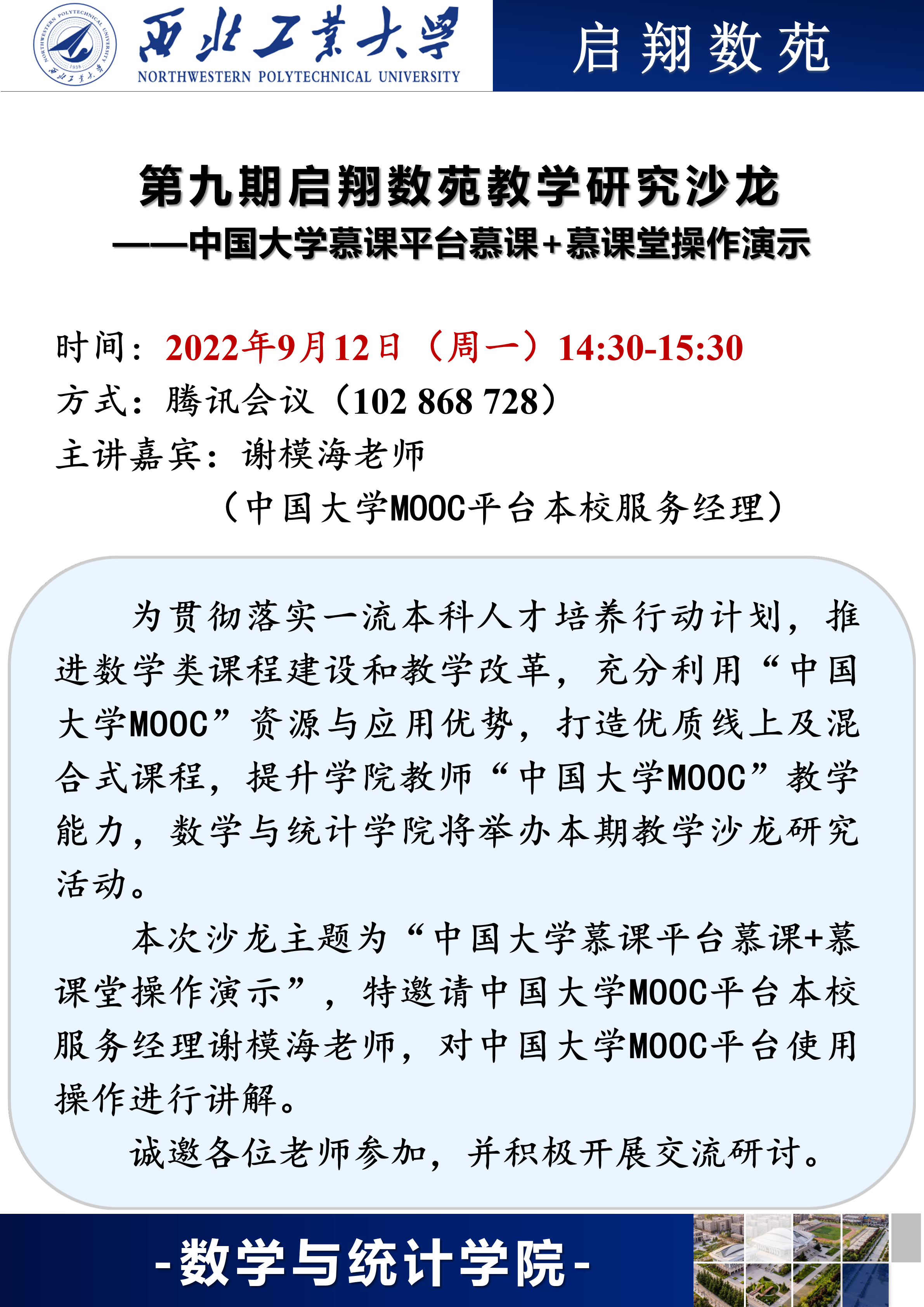 为贯彻落实一流本科人才培养行动计划,推进数学类课程建设和教学改革,充分利用“中国大学MOOC”资源与应用优势,打造优质线上及混合式课程,提升学院教师“中国大学MOOC”教学能力,小宝寻花 将举办本期教学沙龙研究活动。