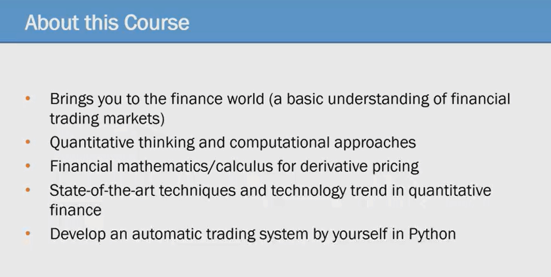 量化金融是利用数学模型和计算工具与大型数据集在金融市场中实现盈利或降低风险的方法。量化金融专注于数学模型的定价金融产品和实施这些模型和应用。本次课程介绍了这些量化和计算方法。