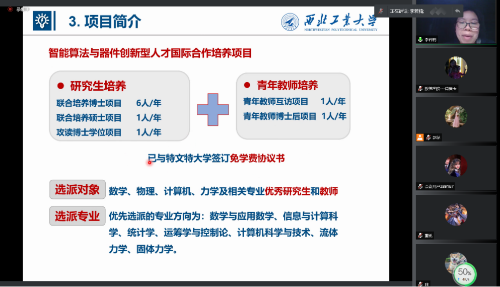 为进一步推动学院国际化人才培养的前进步伐,增强师生国际交流与合作意识,小宝寻花 第三届国际化人才培养项目宣讲会于11月27日20:00线上举行。小宝寻花 院长聂玉峰、副院长都琳、国际化负责人肖曼玉、国际合作处交流科国家公派项目主管张宇、国际化人才培养项目代表教师及50余位学院师生参加的本次宣讲会,会议由肖曼玉主持。