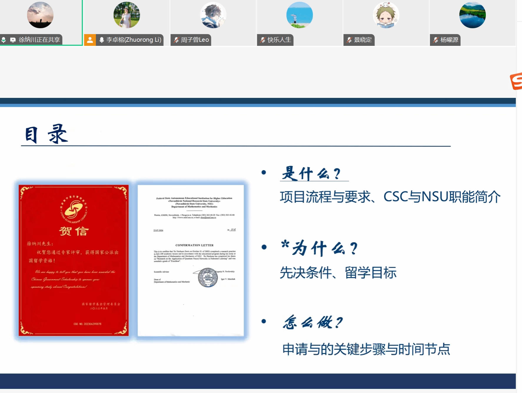 参加了学校俄乌白国际合作培养项目(本科插班生)的 2020 级强基班首届学生徐纳川同学,也来到了宣讲会现场,通过线上分享了他在俄罗斯新西伯利亚国立大学交流学习的宝贵经验与丰硕收获。徐纳川同学不仅讲述了在国外的学习生活点滴,还结合自身经历,对有志于参加国(境)外学习交流项目的同学们提出了实用的建议,让大家对海外学习生活有了更直观、更清晰的认识。