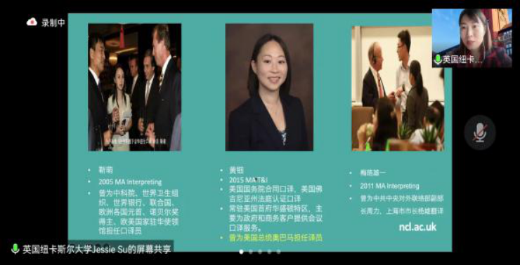 接下来,Jessie Su老师从学校历史、学科特色、专业申请、课程设置等维度介绍了英国纽卡尔斯大学,以一批在中科院、世界卫生组织、联合国等国内外顶尖机构从事翻译工作的毕业生为例,重点分享了纽卡尔斯大学高水平学术就业情况。