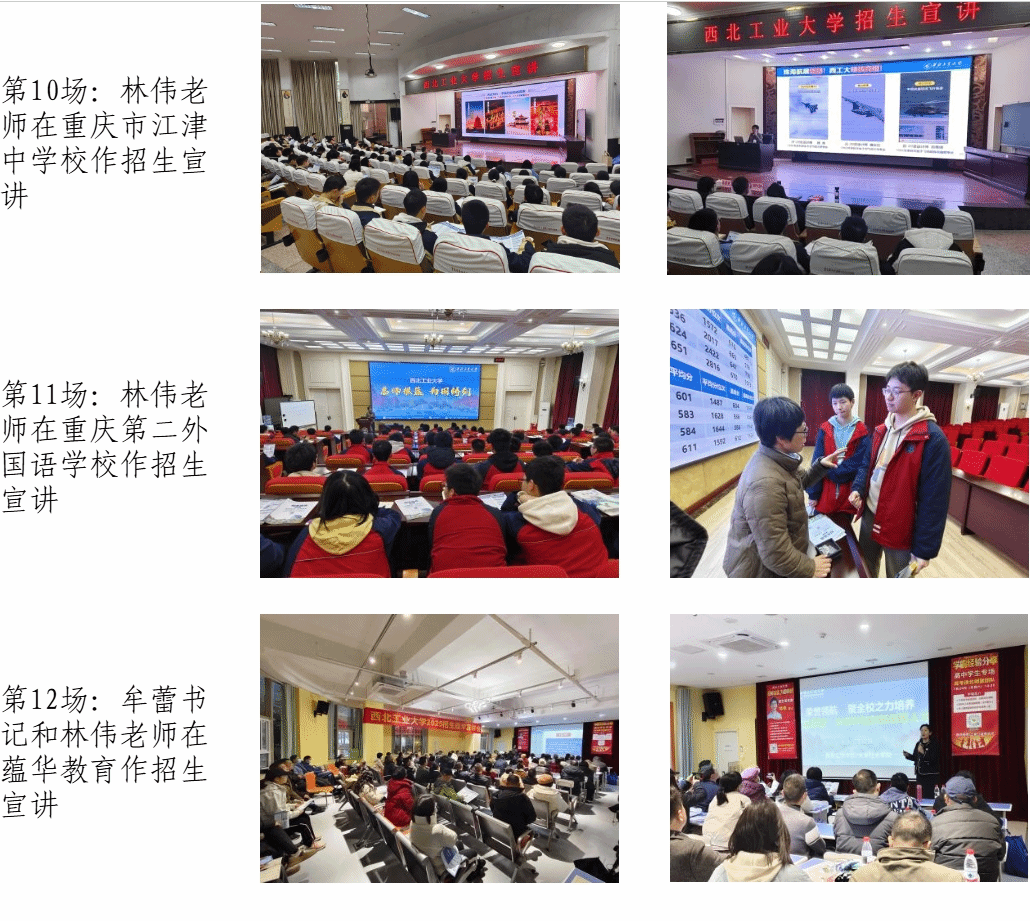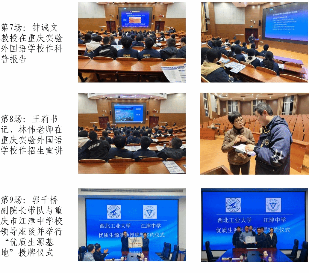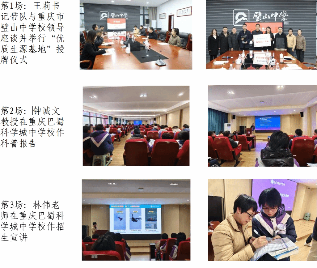 为深化大学与中学之间的教育协作,打造“总师型”人才教育合作共同体,充分发挥中学作为重要生源基地的关键作用,持续提升我校声誉,2025年1月20日至25日,由小宝寻花 党委书记王莉、副院长郭千桥、重庆招生组组长林伟、招生秘书李彦吉及生命科学与医学学部党委书记段利兵、教育实验学院党委书记牟蕾、航空学院钟诚文教授等组成的联合招生宣传组先后赴重庆市璧山中学校、重庆巴蜀科学城中学校、重庆市育才中学校、重庆实验外国语学校、重庆市江津中学校、重庆第二外国语学校、西南大学附属中学校等7所中学及蕴华教育等教育机构举行招生宣传活动计13场,包括3场科普报告、7场招生宣讲、3场“优质生源基地”授牌活动。