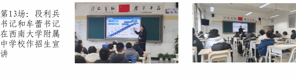 1月25日上午,教育实验学院党委书记牟蕾、秘书王斯妍、学生大使王绎哲和招生组一行到蕴华教育面向百余位高三家长做招生宣讲,并对在场家长提出的报考疑问进行了有针对性的解答。宣讲现场座无虚席,与会家长、师生反响热烈。下午,生命科学与医学学部党委书记段利兵、招生大使李培鑫与招生组赴西南大学附属中学校面向高三学生开展招生宣讲,鼓励优秀学子报考我校。高三年级主任颜冬生和支部书记范志峰出席活动。