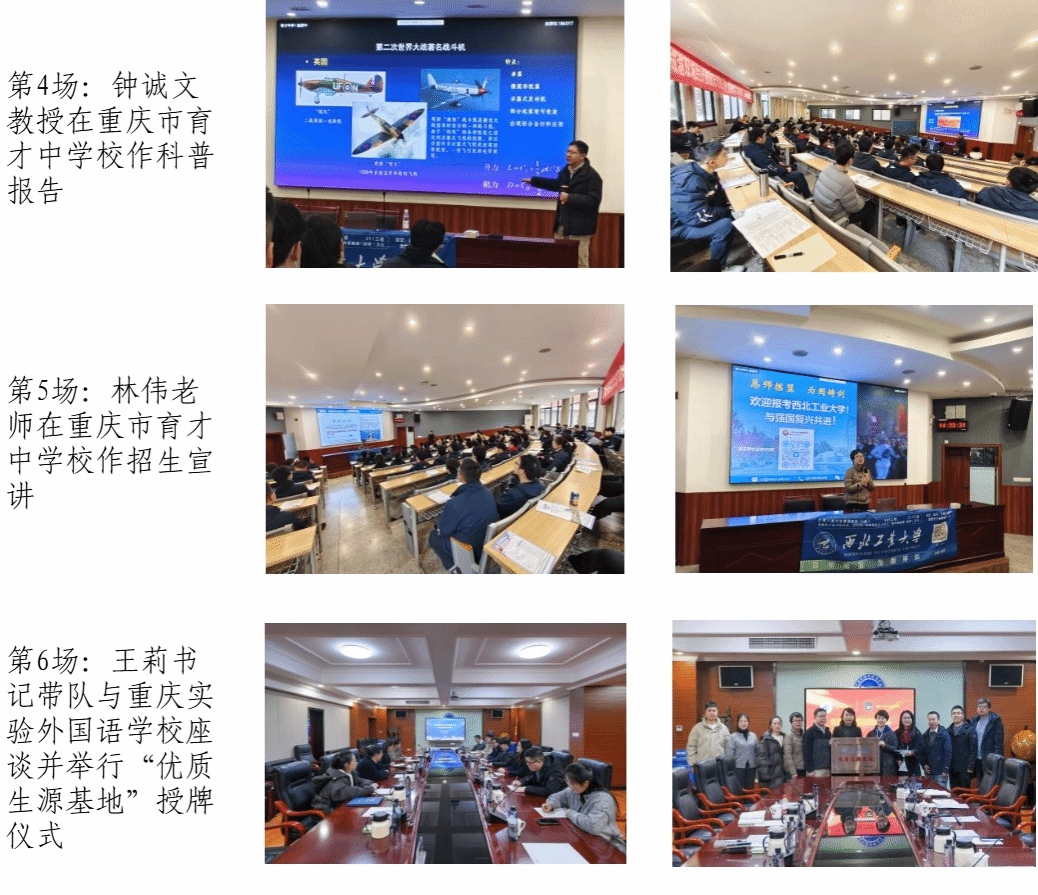 1月21日上午,王莉书记与招生组受邀到重庆市育才中学校开展招生宣传活动,教务主任俞建操出席活动。面向高三学生进行招生宣讲,钟诚文教授做客《行知讲坛》第1期进行科普讲座,现场气氛热烈火爆。下午,王莉书记带领招生组来到重庆实验外国语学校进行“优质生源基地”授牌活动,并赠送J-20模型。重庆实验外国语学校党委书记肖艳、校长钟艳等领导参加了授牌仪式。双方围绕学生研学、中外合作等议题深入探讨。会后,钟诚文教授做科普报告,受到学生喜欢,现场气氛热烈。王莉书记、林伟老师分别进行招生宣讲。