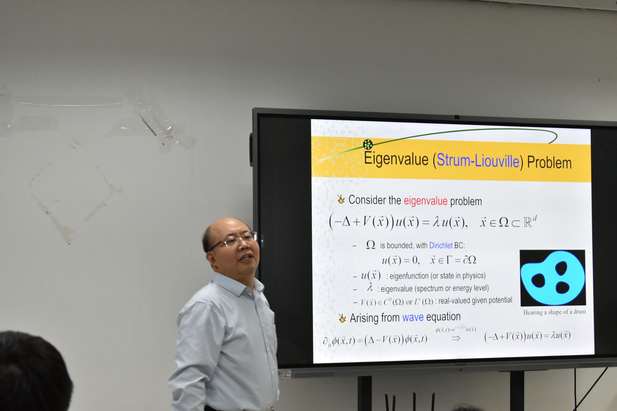 报告伊始,包维柱教授向与会师生详细介绍了新加坡国立大学的概况、教育模式、招生申请流程,以及理学院的学科背景和学术发展情况。接着,包教授深入讲解了在带有Dirichlet边界条件的有界区域上,Laplacian和Schrödinger算子特征值渐进性的Weyl定理和Weyl猜想。他接着提出了分数薛定谔算子(FSO)的广义Weyl定律及基本间隙猜想,并分享了从渐进性分析和数值研究方面对Gross-Pitaevskii方程能量和化学势基本间隙的最新研究进展。
