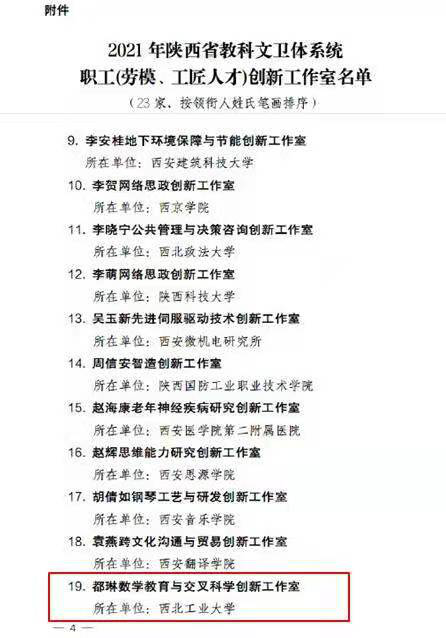 日前,从陕西省教科文卫体工会传来喜讯,在公布的23所“2021年陕西省教科文卫体系统职工(劳模、工匠人才)创新工作室”名单中,由小宝寻花 都琳教授领衔成立的“都琳数学教育与交叉科学创新工作室”榜上有名,正式获批挂牌。